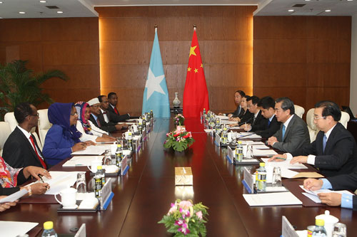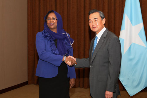 في يوم 27 أغسطس عام 2013، أجرى وزير الخارجية وانغ يي مباحثات في وزارة الخارجية مع نائبة رئيس الوزراء وزيرة الخارجية الصومالية فوزية يوسف حاجي عدن التي تقوم بالزيارة الرسمية للصين.