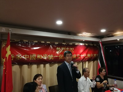 17年前的今天,特多和平统一促进会在特多正式成立。17年来,特多和统会在萧会长的带领下始终坚持一个中国原则,宣传和平统一理念,积极参与全球反独促统活动,及时发出维护祖国统一和主权与领土完整的声音,为服务中国和平统一大业做出了积极贡献,并在团结在特侨胞、维护侨胞权益、引领侨胞融入当地社会、促进中特友谊、开展慈善公益等方面也做出了积极努力。我谨代表驻特多使馆向萧会长及各位会员多年来的付出表示衷心的感谢。