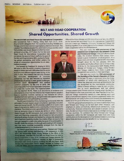 2019年5月7日,驻特立尼达和多巴哥大使宋昱旻在特立尼达和多巴哥主流媒体《卫报》、《快报》和《每日新闻》发表题为《“一带一路”合作——共享机遇,共谋发展》的署名文章。全文如下: