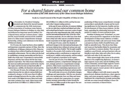 2021年12月16日,驻宿务总领事贾力在菲律宾媒体《太阳星报》发表署名文章,介绍中国-东盟建立对话关系30周年以来的合作与成就。全文译文如下: