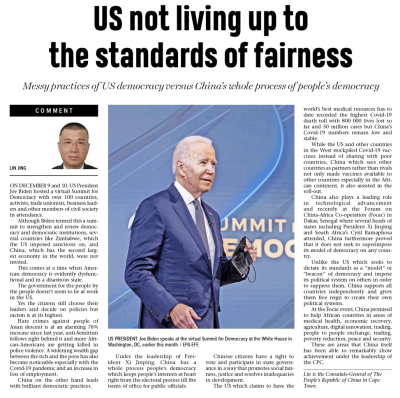 2021年12月23日,驻开普敦总领事林静在南非主流媒体《开普时报》总领事专栏发表题为《美国的民主毫无公平可言》的署名文章,全文如下: