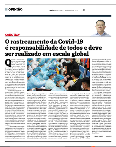 2021年7月8日,驻安哥拉大使龚韬在安《国家报》发表题为《病毒溯源是世界各国共同义务,应在全球范围展开》的署名文章。全文如下: