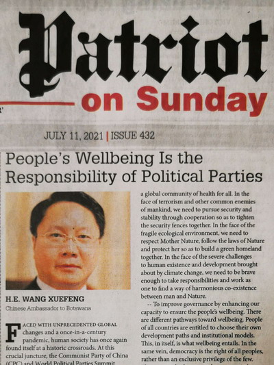 2021年7月11日,驻博茨瓦纳大使王雪峰在博主流媒体《爱国者报》发表题为《为人民谋幸福就是政党的责任》的署名文章。全文如下: