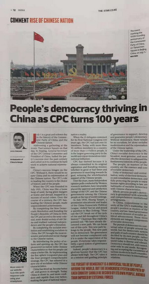 2021年7月9日至11日,驻肯尼亚大使周平剑在肯《星报》《旗帜报》《人民报》和首都调频网站等媒体发表题为《百年中国共产党:人民民主蓬勃发展》的署名文章。全文如下:
