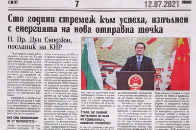 2021年7月12日,驻保加利亚大使董晓军在保《大地报》发表署名文章《百年磨砺铸伟业 风华正茂再出发》,全文如下: