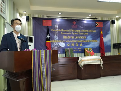 2021年7月12日,中国援东帝汶数字电视传输系统示范项目移交仪式在东总理府举行,驻东帝汶大使肖建国出席并致辞,讲话全文如下:
