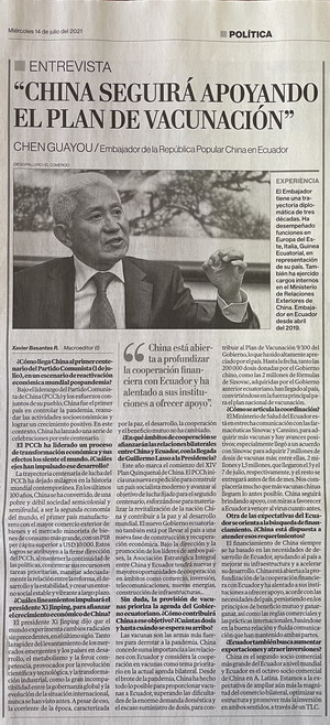 近日,驻厄瓜多尔大使陈国友就中国共产党成立100周年、中厄双边关系、两国疫苗合作等议题接受厄主流媒体《商报》书面采访。2021年7月14日,该报发表了采访内容。采访全文如下: