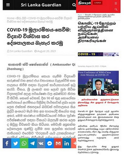 连日来,斯里兰卡最大英文报纸《每日镜报》、僧伽罗语网站《斯里兰卡卫报》、泰米尔语官方报纸《周日太阳报》等各语种媒体纷纷刊登驻斯里兰卡大使戚振宏署名文章——《新冠病毒溯源:相信科学调查,摒弃政治操弄》。全文如下: