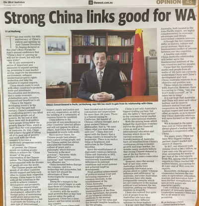 2018年6月7日,西澳州发行量最大的《西澳人报》(The West Australian)发表驻珀斯总领事雷克中的署名文章《中国的对外政策与中澳关系》,全文如下: