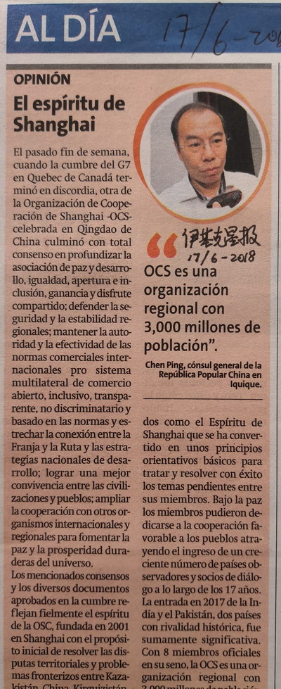 2018年6月17日,驻伊基克总领事陈平在智利北部地区主流媒体《伊基克星报》发表题为《上海精神》的署名文章,全文如下: