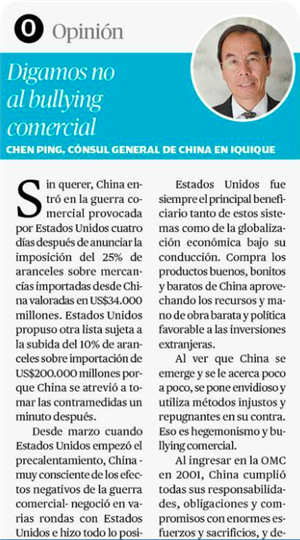 2018年7月20日,驻伊基克总领事陈平在智利《安托法加斯塔信使报》发表题为《让我们对贸易霸凌主义说不》的署名文章,全文如下: