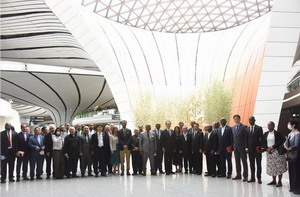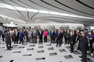 | Diplomatic envoys visit the Terminal of Beijing Daxing International Airport. | Group photo of Chinese and foreign representatives at the Beijing Daxing International Airport. |