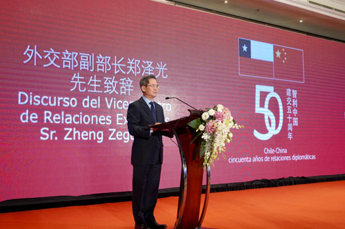 On December 11, 2020, Vice Foreign Minister Zheng Zeguang attended upon invitation the reception marking the 50th anniversary of the establishment of China-Chile diplomatic ties held by the Embassy of Chile in China.