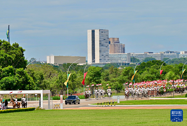 The sky is clear in the early summer of Brasilia. Inside the Alvorada Palace, the lush lawn is glittering, and 450 protocol soldiers line up in salutation. Escorted by 120 Independence Dragoons, President Xi arrived by car at the square before the Alvorada Palace.
