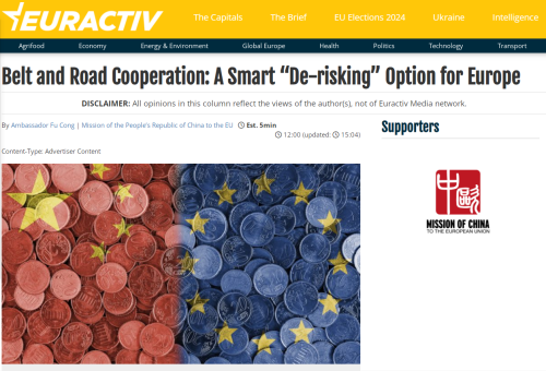 On March 12, 2024, Ambassador Fu Cong, Head of Chinese Mission to the EU, published an Op-Ed named "Belt and Road Cooperation: A Smart “De-risking” Option for Europe". Here is the full text: