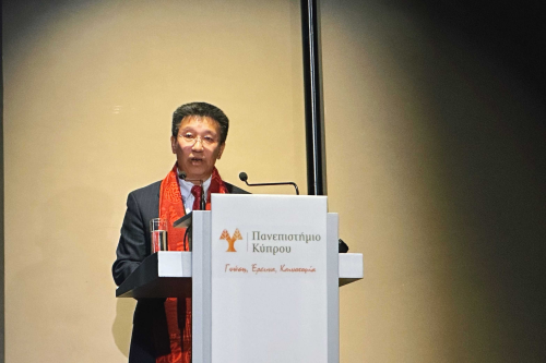 On behalf of the Chinese Embassy in Cyprus, let me begin by extending heartfelt thanks to the government of Cyprus and the University of Cyprus for your great support for this event! My special thanks goes to President Nikos Christodoulides, who has made a special video address, extending festive greetings to President Xi Jinping and the Chinese people.