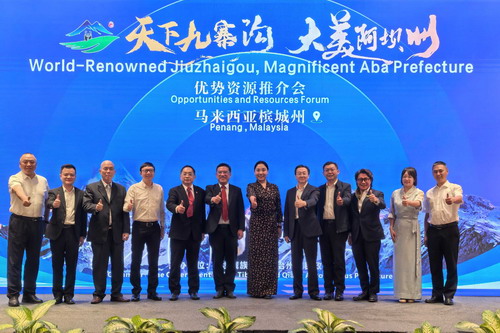 On July 3, Chinese Consul General in Penang Zhou Youbin attended the “World-Renowned Jiuzhaigou, Magnificent Aba Prefecture” Advantage Resources Promotion Conference. Also present were more than 100 people including Penang State Executive Councillor for Tourism and Creative Economy YB Wong Hon Wai, Director of the Publicity Department of Aba Prefecture, Sichuan Province Ms. Yidangcuo, Deputy President of Malaysia-China Chamber of Commerce Penang Branch Dato' Teh Eng Hin, Deputy National President of Small and Medium Enterprises Association Malaysia Mr. Calvin Kwan, people from local tourism organizations and media.