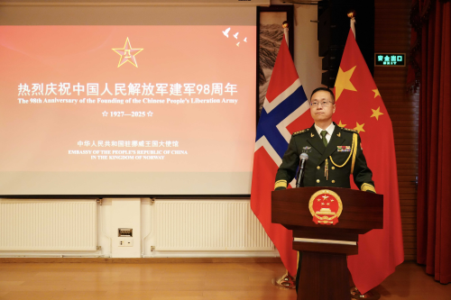 Senior Colonel Li Shangjie, Defence Attaché of the Chinese Embassy in Norway, delivered a speech and highlighted that over the past 98 years, under the leadership of the Communist Party of China, the PLA has upheld its fundamental purpose of serving the the people wholeheartedly and dedicated itself to the liberation and wellbeing of the people. This year marks the 80th anniversary of the victory of the Chinese People’s War of Resistance against Japanese Aggression and the World Anti-Fascist War. China is ready to cooperate with all peace-loving nations in the world to uphold the UN-centered international system and resolutely resist all forms of hegemonism and power politics so that a community with a shared future for humanity can be achieved.