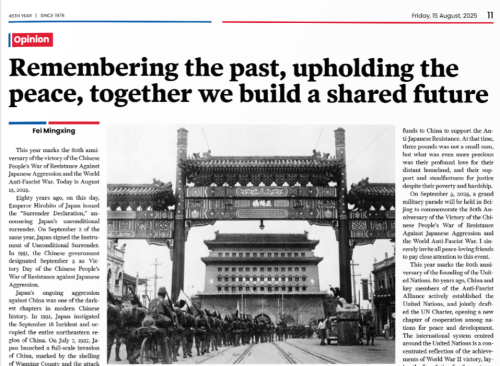 On August 15, 2025, Chinese Ambassador to Samoa Fei Mingxing published a signed article titled “Remembering the Past, Upholding the Peace,Together We Build a Shared Future”in Samoa Observer. The full text is as follows: