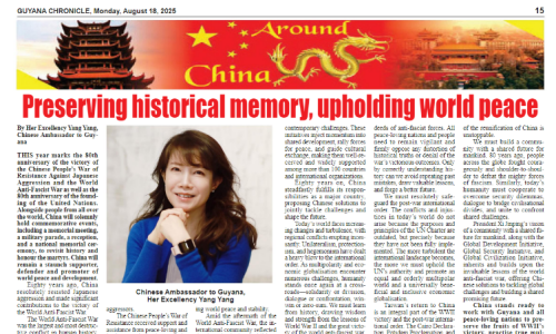 On August 17, 2025, H.E. Yang Yang, the Chinese Ambassador to Guyana, published a signed article titled “Preserving Historical Memory and Upholding World Peace” in leading Guyanese media outlets, including the Guyana Chronicle, Guyana Times, Kaieteur News, and Stabroek News. The article commemorates the 80th anniversary of the victory of the Chinese People’s War of Resistance Against Japanese Aggression and the World Anti-Fascist War. In the article, Ambassador Yang highlighted the significant historical contributions of the Chinese People’s War of Resistance Against Japanese Aggression to the victory of the World Anti-Fascist War. She also reviewed China’s important role in promoting world peace and development, and called for upholding a correct historical view of WWII, firmly safeguarding the post-war international order, resolutely adhering to the one-China principle, implementing the three global initiatives, and jointly building a community with a shared future for mankind.
