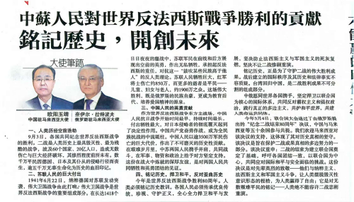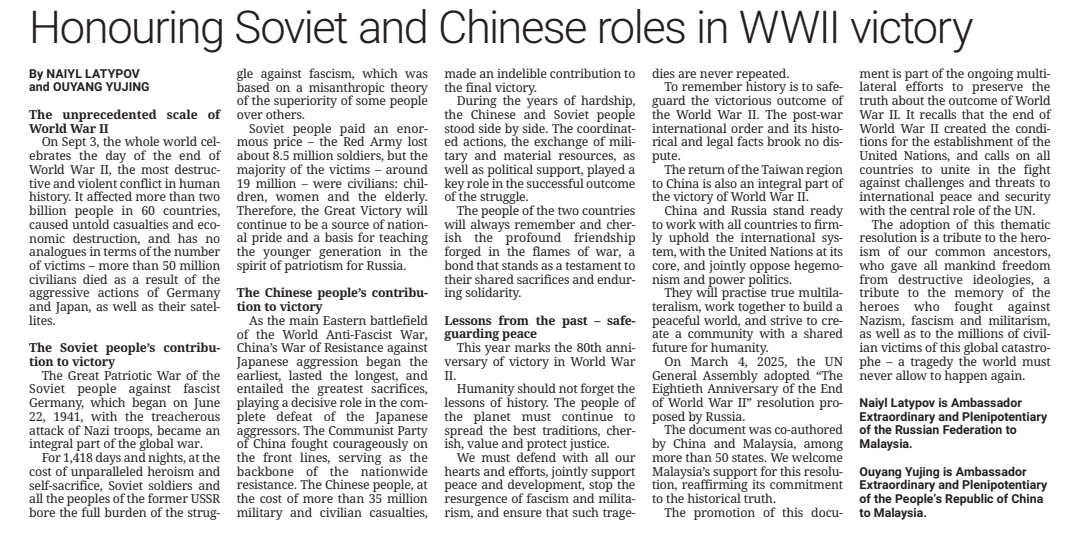 On September 3, Chinese Ambassador to Malaysia H.E. Ouyang Yujing and Russian Ambassador to Malaysia H.E. Naiyl Latypov have issued a joint article titled “The Contribution of the Chinese and Soviet Peoples to Victory in World War II: Remember History and Build Better Future”, which has been published on Malaysia’s mainstream Chinese-, English-, and Malay-language media. Full text as follows: