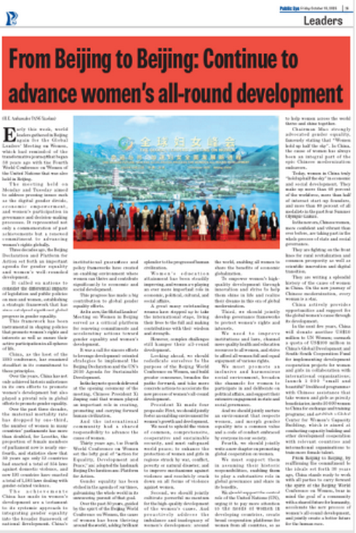 On October 17, Ambassador Yang Xiaokun published a signed article titled “From Beijing to Beijing: Continue to Advance Women’s All-Round Development” on Public Eye and The Reporter. Here's the full text.