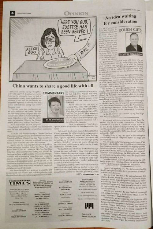 China and the Philippines are so close geographically. Working together for development and sharing a better life should be the common aspiration of our peoples. We are willing to join hands with the Philippines to uphold mutual respect, strengthen exchanges across all fields, and ensure that economic and trade cooperation continues to benefit our peoples, enhancing their sense of fulfillment and happiness, and jointly forge a new chapter of win-win cooperation.