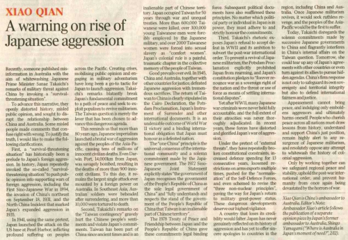On December 9, 2025, Chinese Ambassador to Australia Xiao Qian published an article entitled "Indulging Militarism Undermines International Order" on the Australian mainstream newspaper The Australian, making solemn criticism on the misinformation recently released in Australia by someone to whitewash Japanese Prime Minister Sanae Takaichi’s remarks of military threat against China by invoking a “Survival-Threatening Situation” and emphasizing that Takaichi’s remarks on “Taiwan contingency” gravely hurt the Chinese people’s sentiments and violate Japan’s commitments, and her rhetoric exposes Japan’s refusal to accept defeat in World War II and its attempt to subvert the post-war international order. The article calls on people who cherish peace across all nations to understand and support China’s just position, remain highly alert to any resurgence of Japanese militarism, resolutely oppose any attempt to whitewash the history of colonial aggression, safeguard regional peace and stability and uphold the post-war international order.
