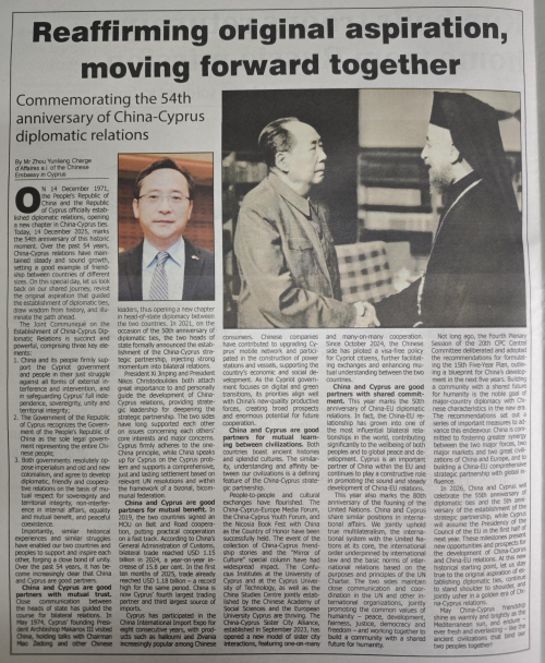 On 14 December 2025, Chargé d’Affaires a.i. of the Chinese Embassy in Cyprus Zhou Yunliang published a signed article titled Reaffirming Original Aspiration, Moving Forward Together on Cyprus Mail, in celebration of the 54th anniversary of China-Cyprus diplomatic relations. The full text is as follows: