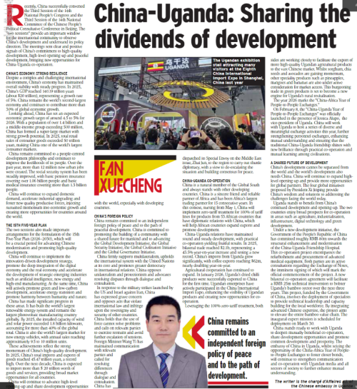On March 23 and 25, 2026, Mr. Fan Xuecheng, Chargé d'Affaires ad interim of the Chinese Embassy in Uganda, published a signed article entitled "Sharing Development Dividends: New Impetus for Global Peace and China-Uganda Cooperation" in Uganda's mainstream newspapers, Daily Monitor and New Vision. The full text is as follows:
