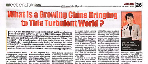 On March 29, Ambassador Huang Shifang published on Le Mauricien an article entitled “What Is a Growing China Bringing to This Turbulent World?”. The full text is as follows: