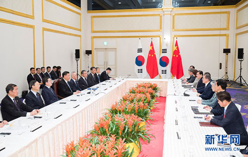 Xi Jinping pointed out that it is in accordance with the trend of history to enhance China-ROK friendly cooperation, which also answers to the common calls of the two peoples. The Chinese side is willing to work with the ROK side to stick to treating each other with sincerity, strive to achieve win-win cooperation, push ahead the continuous development of bilateral relations, and make contributions to the peace and stability of the Korean Peninsula and the region. The two sides need to maintain communication at all levels and hold firmly the general direction of bilateral relations. China and the ROK should seize the opportunity of jointly building the Belt and Road Initiative, accelerate the second-stage negotiations on a China-ROK free trade agreement, and continue to expand cooperation in such fields as trade, science and technology, finance and economy, as well as environment protection. The two countries should also actively carry out people-to-people and cultural exchanges to consolidate friendship between the two peoples. China-ROK cooperation has been completely mutually beneficial with win-win outcomes, and should therefore not be affected by external pressure. Xi Jinping hoped that the ROK side will continue to attach importance to and properly address relevant issues between the two countries. The two sides should boost coordination within multilateral frameworks including the United Nations and the G20, jointly oppose protectionism, support multilateralism and free trade system, and push for building an open world economy.