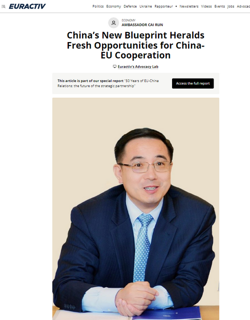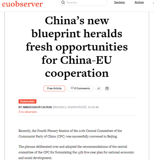 On November 25, 2025, Ambassador Cai Run, Head of the Mission of China to the European Union published an op-ed titled “China’s New Blueprint Heralds Fresh Opportunities for China-EU Cooperation” on Euractiv and EUobserver. The full text is below: