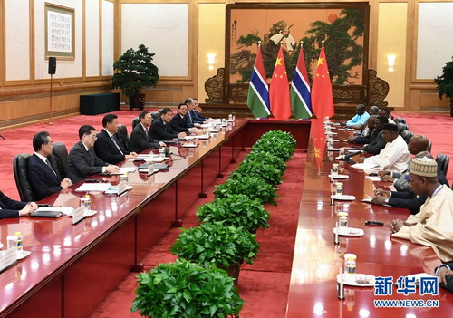 Xi Jinping dio la bienvenida al Presidente de Gambia para asistir al Foro de Cooperación China-África por primera vez y señaló que esto es de gran importancia para las relaciones China-Gambia, las relaciones China-África y la construcción del Foro. Xi Jinping enfatizó que desde la reanudación de las relaciones diplomáticas entre los dos países en los últimos dos años, la cooperación amistosa entre las dos partes ha sido integral y fluida, y las relaciones bilaterales han evolucionado muy bien y rápidamente. China está satisfecha con los logros en el desarrollo de las relaciones bilaterales. La parte china aprecia la adhesión del Presidente y del gobierno de Gambia al principio de una sola China y está dispuesta a seguir captando la dirección general de las relaciones bilaterales con el lado de Gambia, mejorar continuamente la confianza política mutua y continuar apoyándose mutuamente en asuntos que involucran intereses centrales y grandes preocupaciones. China apoya los esfuerzos del gobierno de Gambia para "construir la nueva Gambia" y está dispuesto a fortalecer la cooperación pragmática y ampliar los intercambios de humanidades. China apoya los esfuerzos del lado de Gambia para fortalecer la paz y la seguridad.
