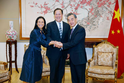 Wang Yi transmitió los cordiales saludos del Presidente Xi Jinping al Presidente Varela. Wang Yi dijo que el Sr. Presidente realizó una exitosa visita a China en noviembre pasado. La atención y la promoción personal del Presidente Xi Jinping y del Presidente han inyectado un fuerte impulso para los intercambios bilaterales y la cooperación entre China y Panamá. Aunque Panamá no tiene gran tamaño físico, la valiente decisión de establecer relaciones diplomáticas con China refleja la ambición grande y la visión global del gobierno y el pueblo de Panamá. En los 15 meses transcurridos desde el establecimiento de relaciones diplomáticas entre China y Panamá, las relaciones bilaterales han presentado un alentador fenómeno de avanzar impetuasamente. La cooperación en comercio, inversión, finanzas, infraestructura, red eléctrica, vuelos directos, educación, cultura y otros campos se ha desarrollado rápidamente. Estamos dispuestos a marchar en la misma dirección junto con la parte panameña, explotar plenamente el potencial de la cooperación entre los dos países y proporcionar beneficios a los dos pueblos con más éxitos de la cooperación. Estamos llenos de confianza en las perspectivas de las relaciones entre China y Panamá.
