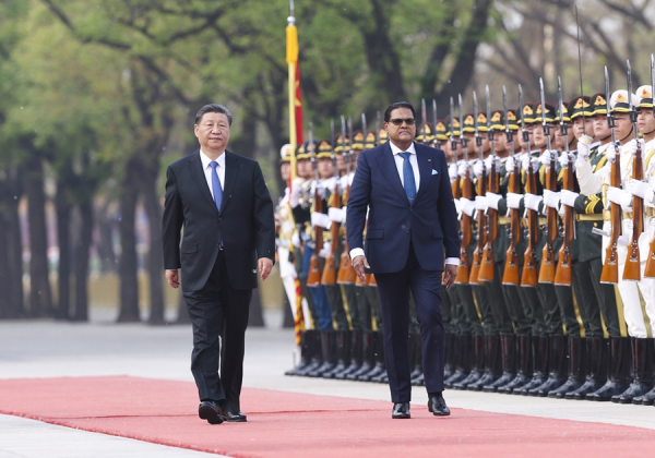 En la tarde del 12 de abril de 2024, el presidente Xi Jinping sostuvo conversaciones en el Gran Palacio del Pueblo, en Beijing, con el presidente de Surinam, Chandrikapersad Santokhi, quien se encontraba de visita de Estado en China.