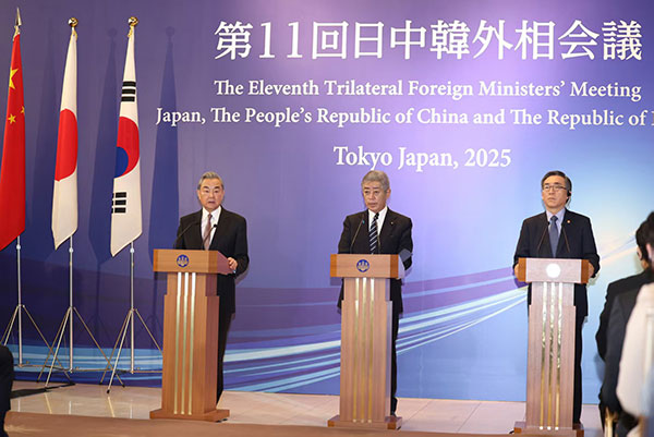 Le 22 mars 2025, heure locale, Wang Yi, membre du Bureau politique du Comité central du Parti communiste chinois et ministre chinois des Affaires étrangères a rencontré la presse en compagnie de ses homologues japonais Takeshi Iwaya et sud-coréen Cho Tae-yul, après avoir participé à la 11e réunion trilatérale des ministres des Affaires étrangères Chine-Japon-République de Corée.