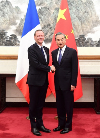 Le conseiller d'Etat et ministre des Affaires étrangères Wang Yi et le conseiller diplomatique du président français Emmanuel Bonne ont co-présidé le 19 juillet 2019 à Beijing les consultations entre les coordinateurs pour le Dialogue stratégique Chine-France.