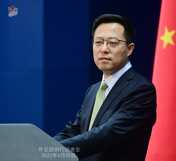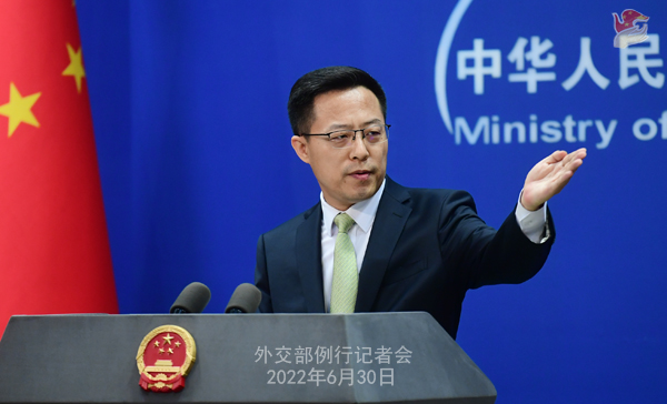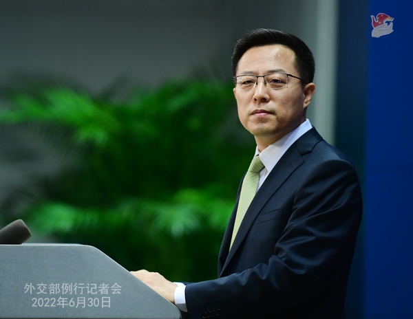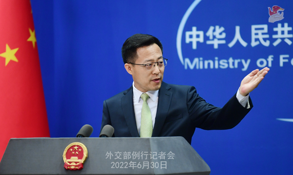 赵立坚:刚才我已经就北约峰会阐述了中方的立场。我想再次强调的是,国家间发展关系应当有利于世界和平与稳定,不应针对第三方或损害第三方利益。中方会密切关注北约相关动向,对损害中方利益的情况,不会坐视不管。