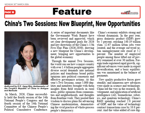 2026年3月30日,驻安提瓜和巴布达大使蒋薇在安巴主流媒体《观点速递》、《观察家报》、“安提瓜新闻网”发表署名文章《中国两会:擘画新蓝图,带来新机遇》,宣介2026年全国两会精神。全文如下: