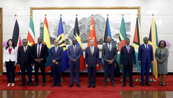 2025年5月12日,中共中央政治局委员、外交部长王毅在京集体会见来华出席中拉论坛第四届部长级会议的安提瓜和巴布达、巴哈马、巴巴多斯、多米尼克、格林纳达、圭亚那、牙买加、苏里南、特立尼达和多巴哥等加勒比建交国外长及代表。