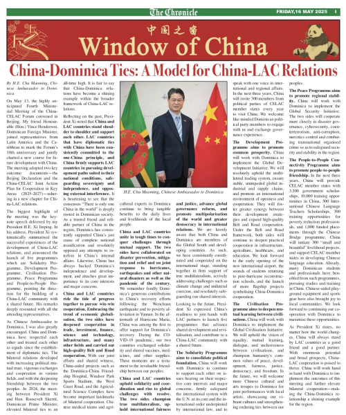 2025年5月16日,驻多米尼克大使储茂明在多主流媒体《纪事报》发表署名文章《让中多关系进一步成为中拉关系典范》,介绍习近平主席在中拉论坛第四届部长级会议开幕式上的重要讲话精神和会议成果。全文译文如下: