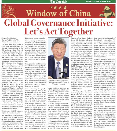 2025年9月12日,驻多米尼克使馆临时代办陈小君在多主流媒体《纪事报》发表署名文章《全球治理倡议:让我们共同行动》,介绍全球治理倡议的五大核心理念,解读中多两国携手推动全球治理改革完善的光明前景。全文译文如下: