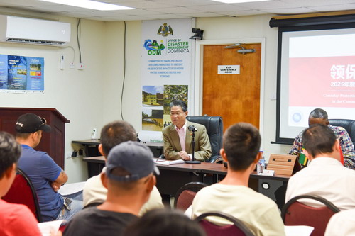 2025年12月13日,驻多米尼克使馆举办2025年度“领保面对面”预防性领保讲座活动。驻多米尼克大使储茂明出席,多国安部长布莱克莫尔和助理警察总监马克西米亚出席并讲解多安全形势、应急处突知识和自我保护技巧,约40名在多侨胞及中资企业和机构代表参加。