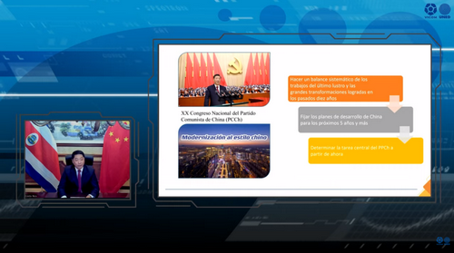 国立远程大学外贸研究部负责人戈瓦埃雷结合去年赴华参访所见所闻分享其对中国新时代发展成就、新发展格局、脱贫攻坚的看法和见解,指出中国式现代化造福广大人民群众、注重高质量发展,对包括哥在内的广大发展中国家推进现代化进程具有借鉴意义。