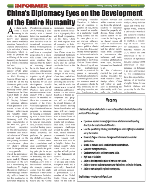 2024年1月12日,驻格林纳达大使韦宏添在格林纳达主流媒体《信息报》上发表署名文章《中国外交着眼全人类发展》。