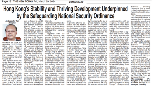 2024年3月28日,驻格林纳达大使韦宏添在格林纳达主流媒体《新今日报》上发表署名文章《维护国家安全条例促进香港稳定繁荣》。