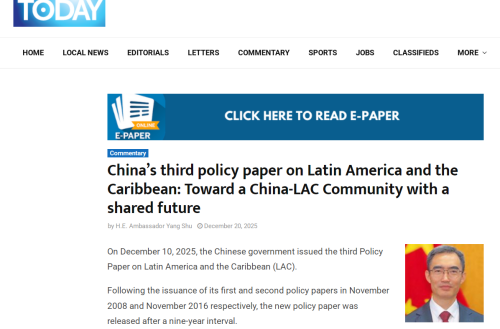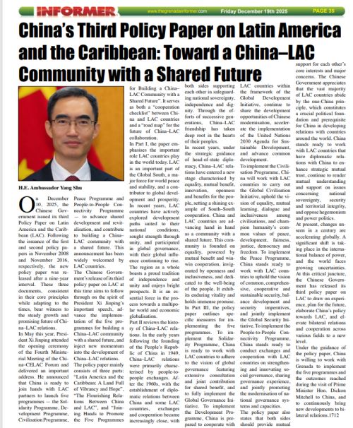 2025年12月18、19、20日,驻格林纳达大使杨舒在格林纳达媒体“今日格林纳达”网、《信息报》、《新今日报》发表署名文章《第三份<中国对拉丁美洲和加勒比政策文件>:携手共建中拉命运共同体》。主要内容如下: