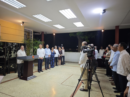 2025年12月19日,驻古巴使馆同古外交部举行新年联谊活动,驻古巴大使华昕出席活动。古共中央政治局委员、古巴外交部长罗德里格斯偕古外交部全体部领导和各主要司局负责人做客中国使馆,与使馆外交官畅叙友谊,欢度新年。