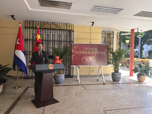 2026年2月10日,驻古巴使馆举行在古师生春节慰问活动,驻古巴大使华昕以及哈瓦那大学孔子学院中方院长葛立胜等50余名师生代表参加。